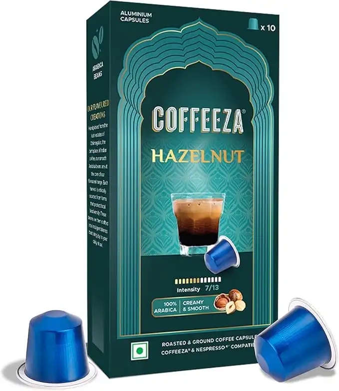COFFEEZA Hazelnut Flavoured Aluminium Capsules, Intensity 7, Nespresso Compatible Pods Box Of 1 (10 Capsules) -Creamy & Smooth Nutty Taste