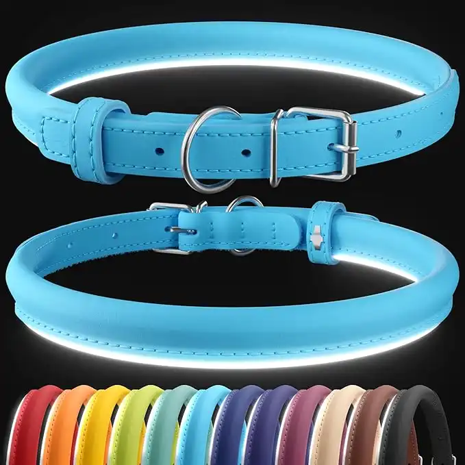 CollarDirect Rolled Leather Dog Collar, Soft Padded Round Puppy Collar, Handmade Genuine Leather Collar Dog Small Large Cat Collars 13 Colors (8-11 Inch, Light Blue)