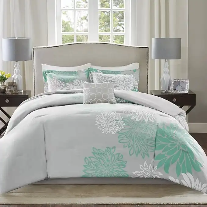 Comfort Spaces Enya 5 Piece Comforter Set Ultra Soft Hypoallergenic Microfiber Floral Print Bedding, Queen, Aqua/Grey — Price History & Tracker | DeserTracker