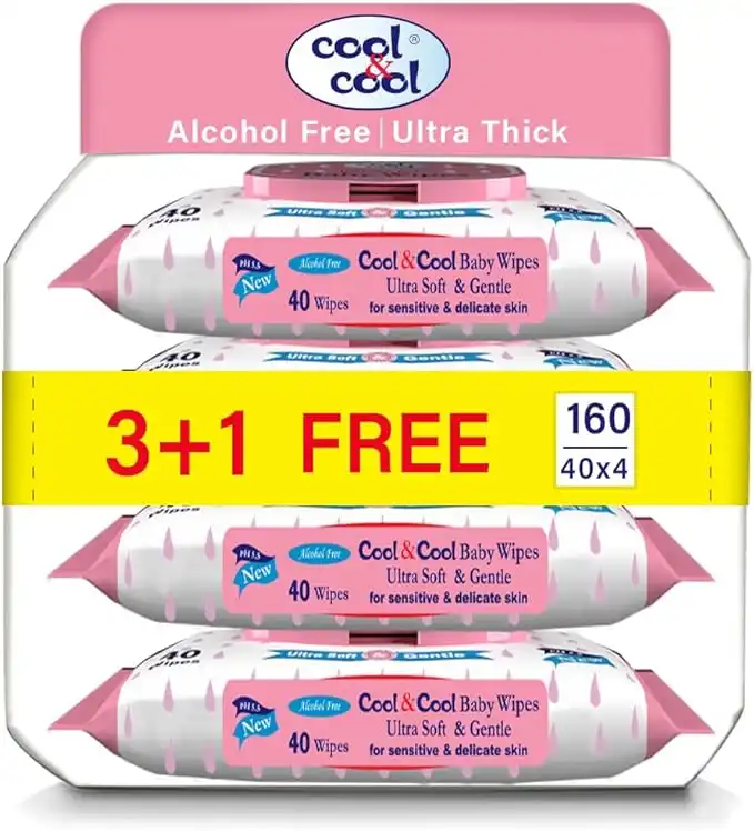 Cool & Cool Baby Wipes 40’s (Pack of 4)-Alcohol Free, Paraben Free,Vitamin E,Aloe Vera,Ultra Soft & Gentle for Sensitive & Delicate Skin - 160 Wipes