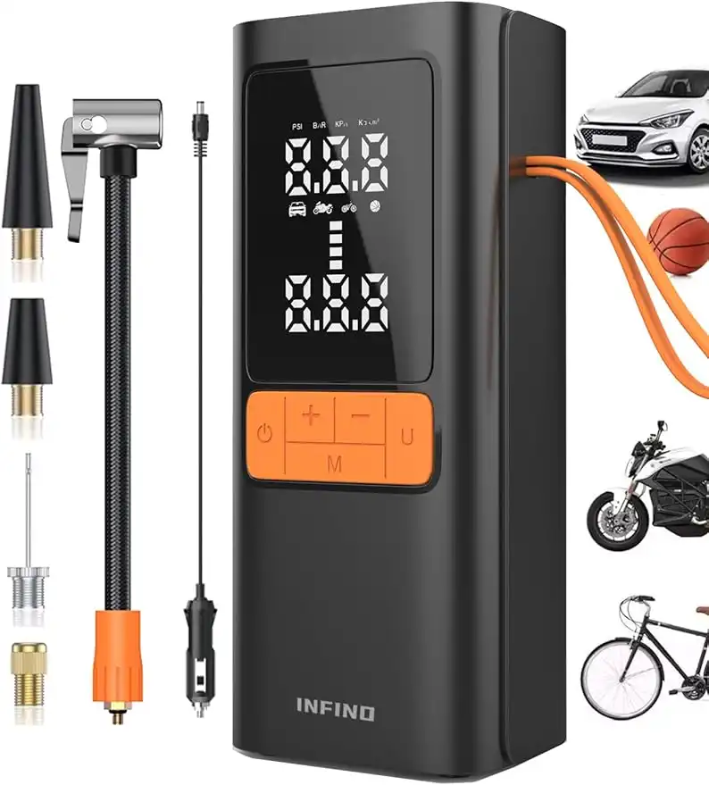 amazon.comCordless Tyre Inflator Air Compressor with Car Charging Cable, Digital Display, Auto Shut Off, 6000mAh Battery, LED Light, Portable Air Pump for Cars, Bikes, Motorcycles, Balls