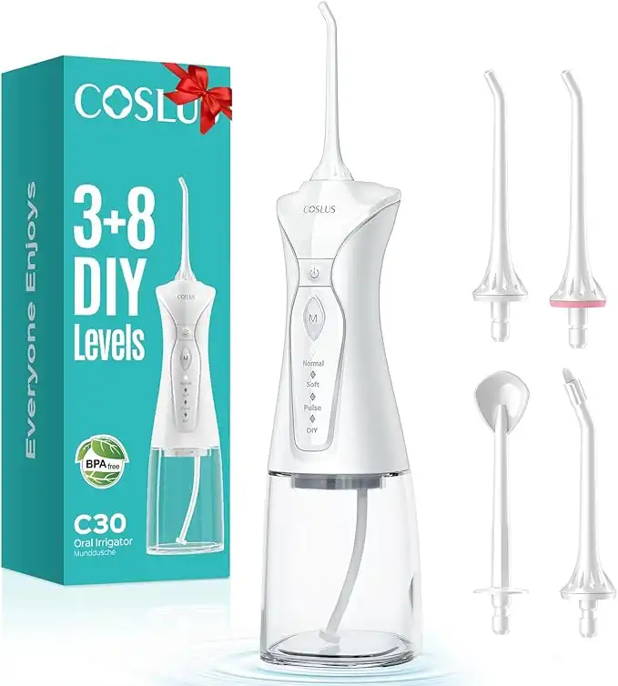 COSLUS C30 Water Flosser for Teeth Braces Gums Care - Portable Oral Irrigator with 3 Modes & 8 DIY Levels for Multiple Users, Cordless for Travel, 300ML, BPA-Free, Home Use, White