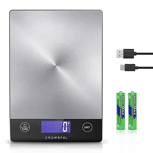 CROWNFUL 15Kg Food Scale, Rechargeable 304 Stainless Steel Digital Kitchen Scale Grams and Ounces with LCD Display and Type-C Charging for Baking and Cooking