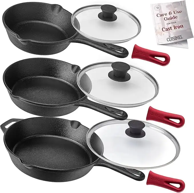 Cuisinel Cast Iron Skillet Set - 6"+8"+10"-Inch + Glass Lids + Silicone Handle Holder Covers - Pre-Seasoned Frying Pan - Oven Safe Cookware - Indoor/Outdoor, Grill, BBQ, Fire, Stovetop, Induction Safe — Price History & Tracker | DeserTracker