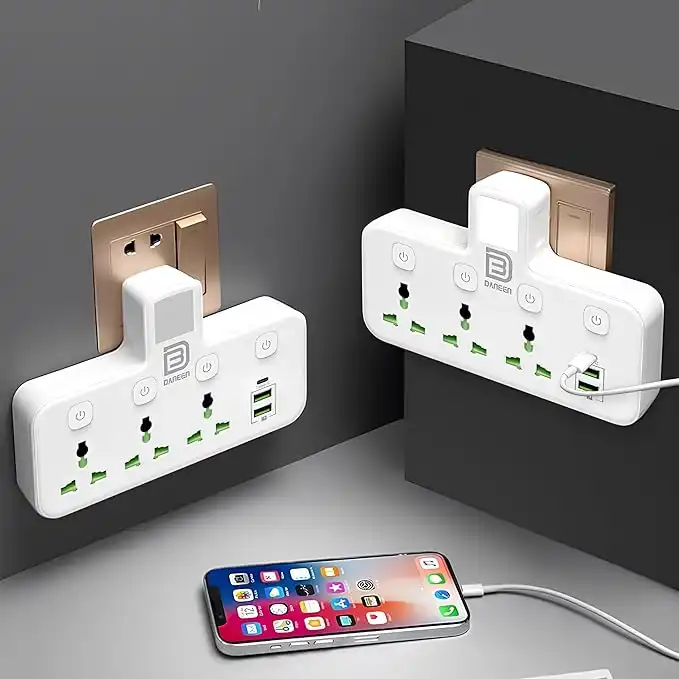 DANEEN 6-in-1 Multi plug power extension socket 3 Outlets, 2 USB Ports, 1 Type-C, LED Night Light, Surge protector, Universal plug adapter 4000W for multiple devices (White)(Socket Extender YS-T06)