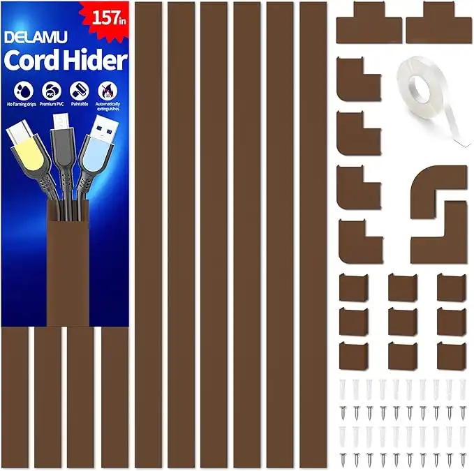 Delamu Wire Hider, 157in Cord Hider Wall, Paintable Wire Covers for Cords, TV Cable Hider Wall Kit, Cable Covers Raceway, Cable Management Hide TV Cords for Wall Mount TV, 10XL15.7 W0.95 H0.55in Brown