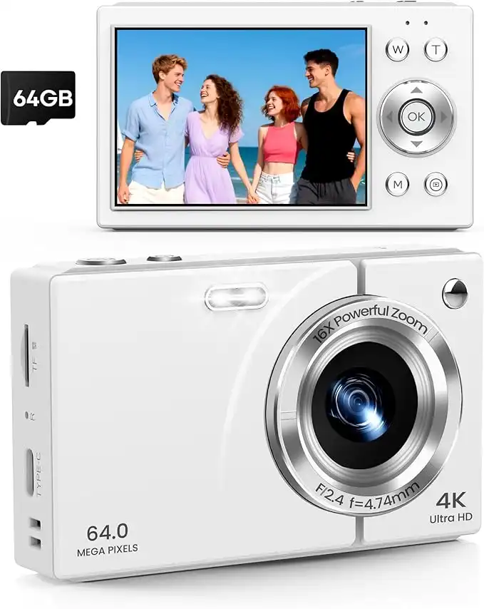 amazon.comDigital Camera 4K with 64MP & 16X Digital Zoom - Autofocus Vlogging Camera with Anti-Shake, 64GB SD Card Included | Compact Travel Camera for YouTube Beginners, Teens & Adults (White)