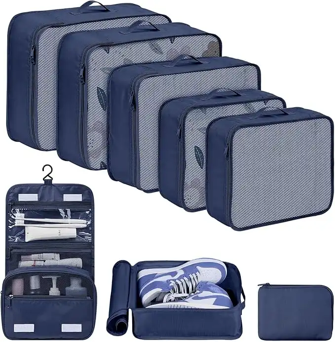 DIMJ Packing Cubes for Travel, 8 Pcs Travel Cubes for Suitcase Lightweight Travel Essential Bag with Large Toiletries Bag for Clothes Shoes Cosmetics Toiletries (Navy Blue)