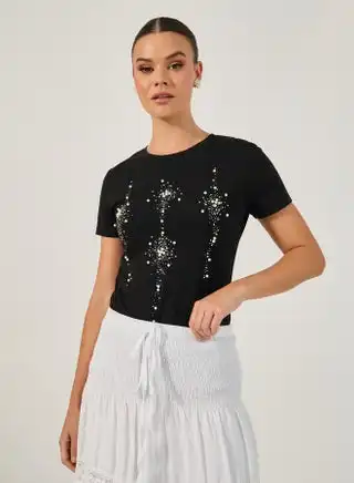 Embellished Fitted Round Neck Short Sleeve T-Shirt