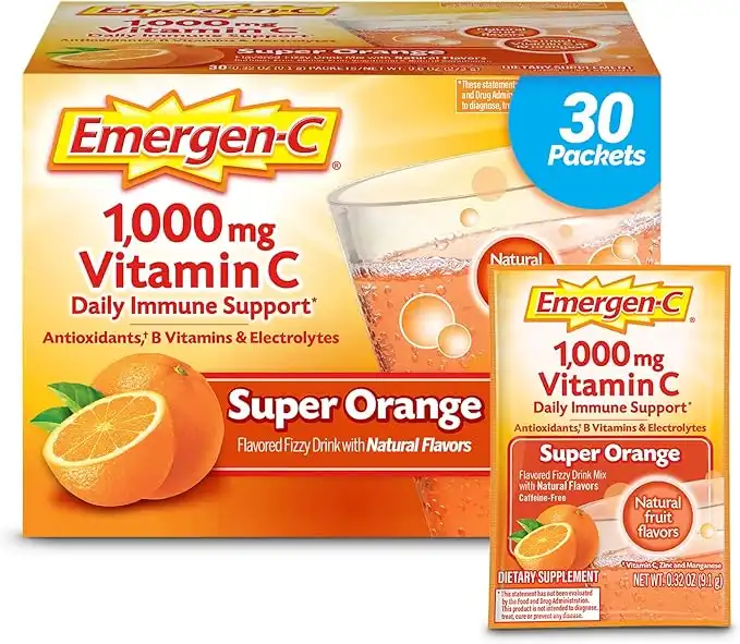 Emergen-C (30 Count, Super Orange Flavor, 1 Month Supply) Dietary Supplement Fizzy Drink Mix with 1000mg Vitamin C, 0.32 Ounce Packets, Caffeine Free