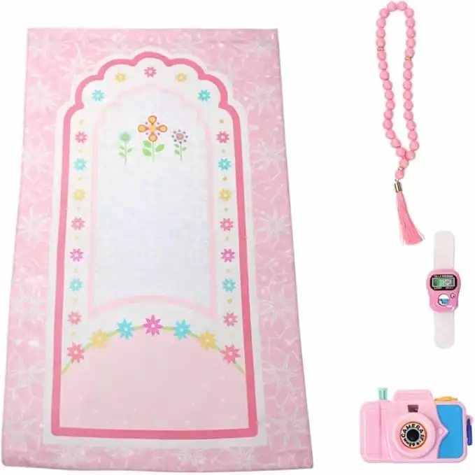 EpicArma 4-in-1 Kids Prayer Mat Pink Islamic Salah Rug with Tasbih, Digital Finger Counter & Toy Camera, Soft Lightweight Janamaz for Children, Special Gift for Ramadan & Eid