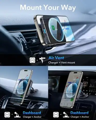 ESR for MagSafe Car Mount Charger, 15W Magnetic Wireless Car Charger, Compatible with MagSafe Car Charger, Air Vent/Dashboard Phone Holder Mount for iPhone 17/16/15/14/13, S25, Fast Charging, Black