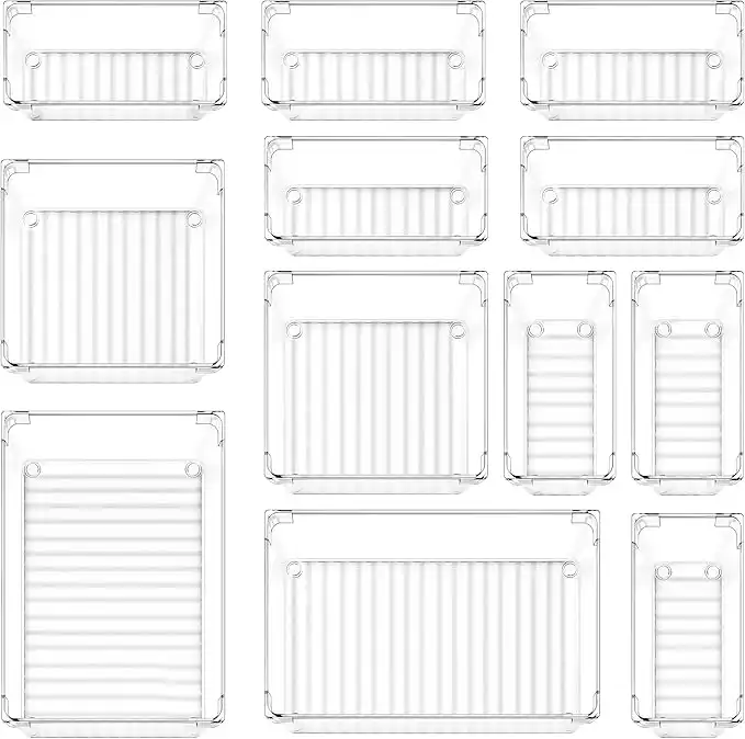 et of 12 Desk Drawer Organiser Trays with 3 Size Clear Plastic Storage Boxes