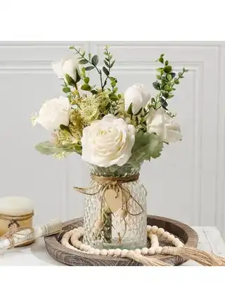 Fake Flowers, Silk Roses Artificial Flowers, White Faux Flower Arrangement Suitable for Home Office Decoration, Dining Table Centerpiece (No Vase)