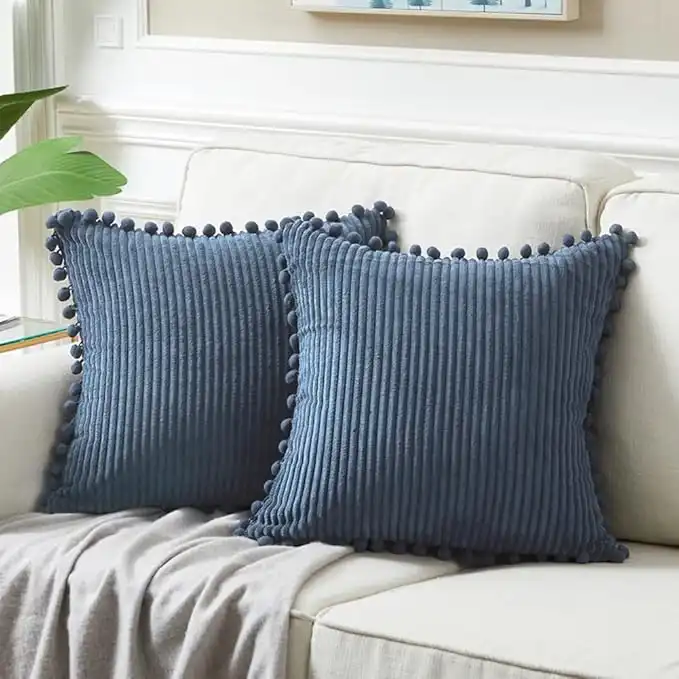 Fancy Homi Pack of 2 Dusty Blue Decorative Throw Pillow Covers 16x16 Inch with Pom-poms for Living Room Couch Bedroom, Soft Corduroy Solid Square Cushion Case 40x40 cm, Rustic Farmhouse Home Decor