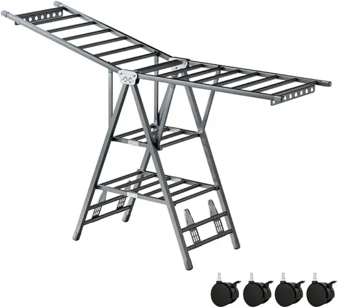 Folding Clothes Dryer Clothes Drying Rack with 4 Shoe Holder, Foldable 3-Tier Laundry Hanger Free-Standing Dryer Rack 3 Height Adjustable Clothes Drying Rack, Windproof (Grey)