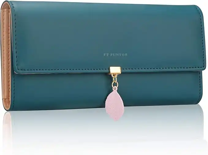 FT FUNTOR PU Leather Wallet for Women RFID Blocking Ladies Leaf Pendant Coin Zipper Long Purse with Multiple Card Slots and Card Holders Phone Pocket(L-Teal Blue) — Price History & Tracker | DeserTracker