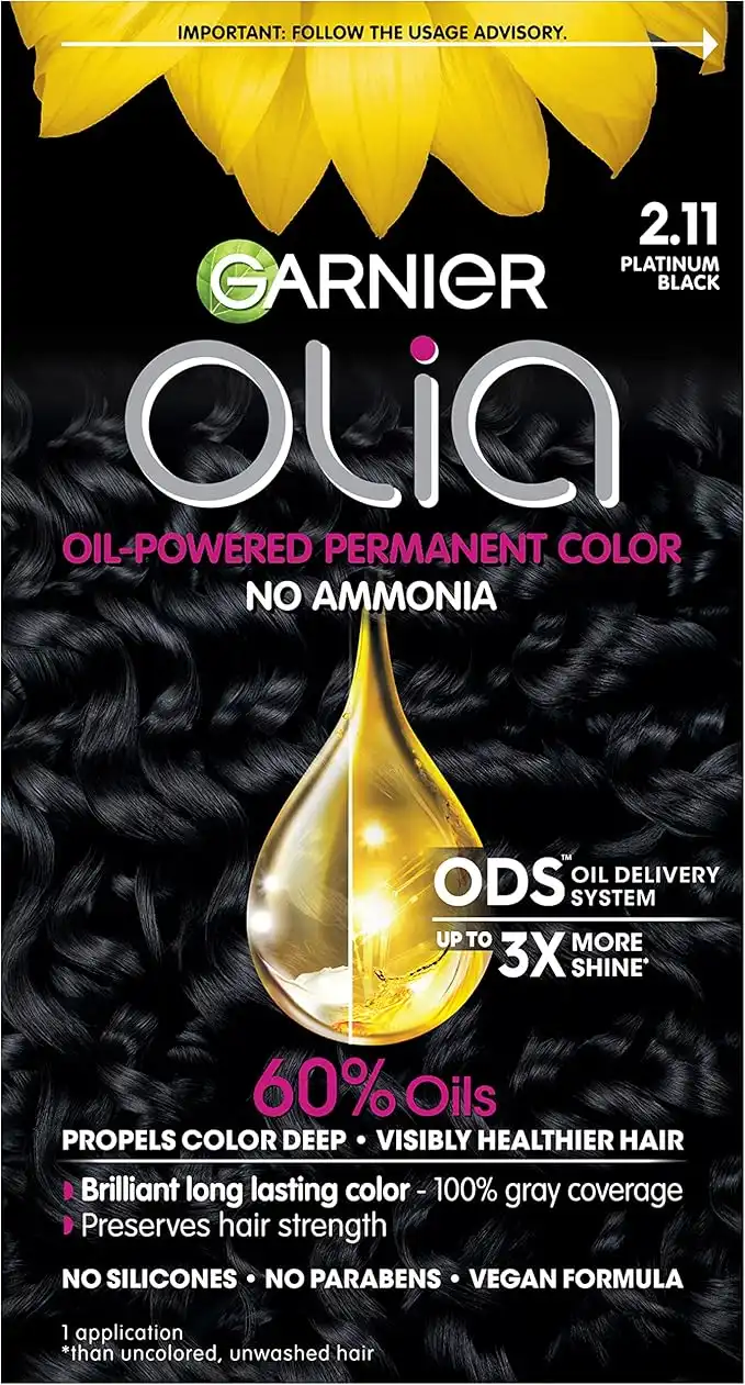 Garnier Olia Ammonia-Free Brilliant Color Oil-Rich Permanent Hair Color, 2.11 Platinum Black (Pack of 1) Black Hair Dye (Packaging May Vary)