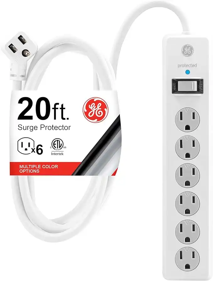 GE, White, 6 Outlet Surge Protector, 8 Ft Extension Cord, Power Strip, 800 Joules, Flat Plug, Twist-To-Close Safety Covers, 14014 20 Ft 50770