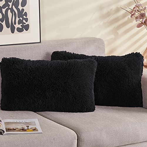 GONAAP Faux Fur Throw Pillow Cover Decorative Pillowcase Cushion Cover for Sofa Bedding Car (Black, 12x20 Inch (2 Pieces))