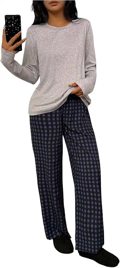 GORGLITTER Women's 2 Piece Plaid Pajama Sets Long Sleeve Crewneck Top and Pants Lounge Sets