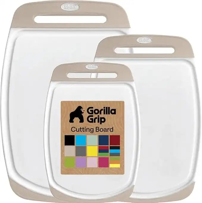 Gorilla Grip The Original Oversized 100% BPA Free Reversible Durable Kitchen Cutting Board Set of 3, Dishwasher Safe, Nonslip Handle Border Plastic Boards, Juice Groove, Chopping Food, Cooking, Almond