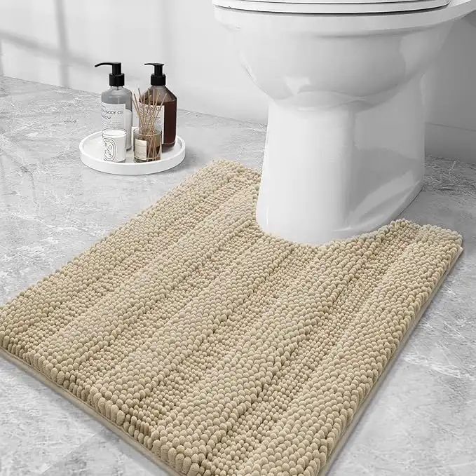 Grandaily Chenille Striped Toilet Rugs U-Shaped 24x20, Extra Soft and Absorbent Bathroom Rugs, Non-Slip Plush Shaggy Bath Rug, Machine Washable Contour Bath Mats for Toilet Base, Beige