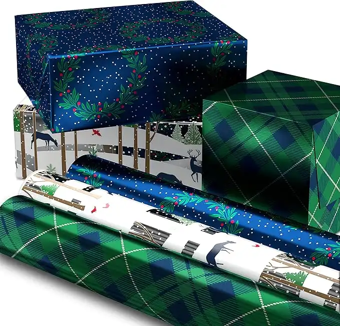 Hallmark Foil Holiday Wrapping Paper with Cut Lines on Reverse (3 Rolls: 60 sq. ft. ttl) Woodland Scene with Deer, Green and Navy Blue Plaid, Wreaths on Navy Blue — Price History & Tracker | DeserTracker