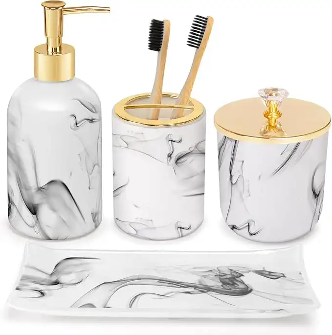 amazon.aeHaturi Bathroom Accessories Set, 5 Pcs Marble Look Sets Soap Dispenser & Toothbrush Holder Counter Top Restroom Apartment Decor Stuff, Resin Kits, Gift for Women and Men, Ink White