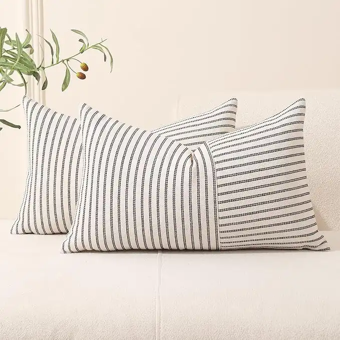 Hckot Farmhouse Pillow Covers 12x20, Lumbar Throw Pillow Covers Set of 2, Black Striped Patchwork Linen Decorative Pillows Cushion Covers for Couch Chair Bedroom Spring Decorations(Black) — Price History & Tracker | DeserTracker