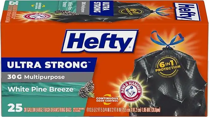 Hefty E85531 Ultra Strong Large Trash Bags (Multipurpose, White Pine, Drawstring, 30 Gallon, 25 Count)