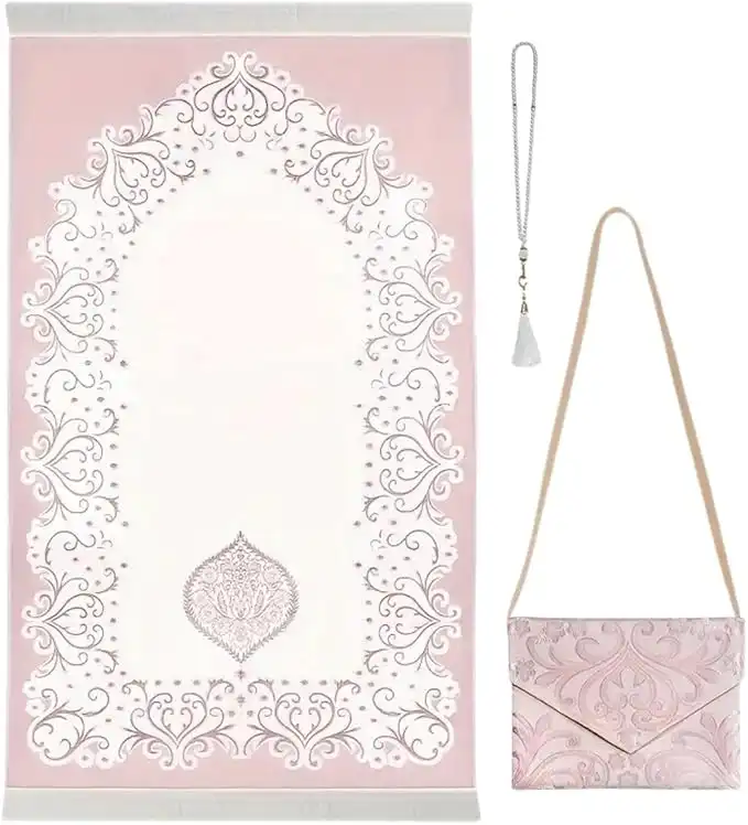 Home Smart Prayer Mat with Prayer Beads and Storage Pouch Portable Mat for Travel Ideal Gift for Men and Women (Pink)