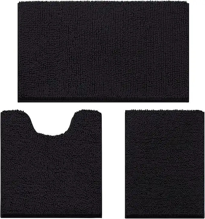 HOMEIDEAS 3 Pieces Bath Rugs Set Chenille Bathroom Door Mats Ultra Soft Non-slip and Absorbent Plush for Tub, Black