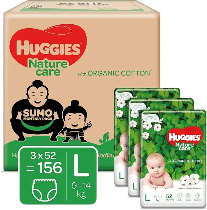 Huggies Nature Care Pants, Sumo Monthly Pack, Large (L) Size Baby Diaper Pants, 156 Count, Nature’s gentle protection with organic cotton — Price History & Tracker | DeserTracker
