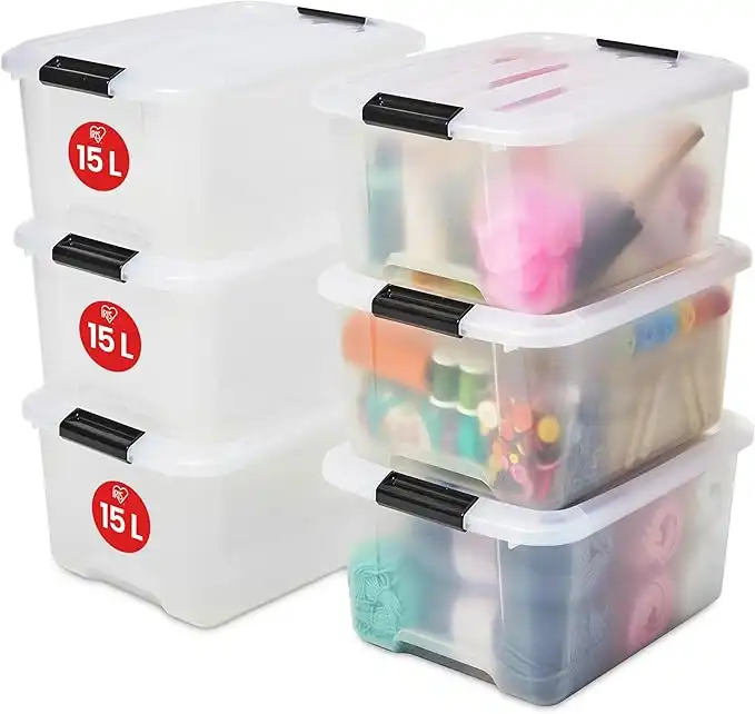 Iris Ohyama, Plastic storage boxes with lid and closing clips, 15L, Set of 6, Integrated Handles, Stackable, BPA free, Bedroom, Office, Living room, TB-15, Clear