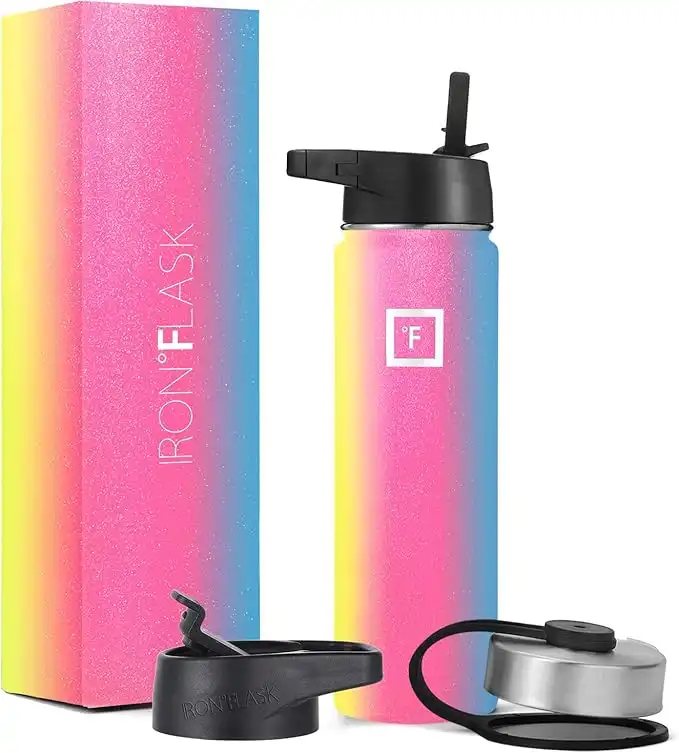 IRON °FLASK Camping & Hiking Hydration Flask with Straw, Wide Mouth Insulated Stainless Steel Sports Water Bottle - 22 oz Rainbow