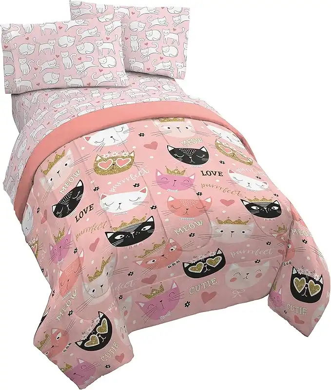 Jay Franco Purrrfect 4 Piece Twin Bed Set - Includes Comforter & Sheet Set - Bedding Features Cats - Super Soft Fade Resistant Microfiber