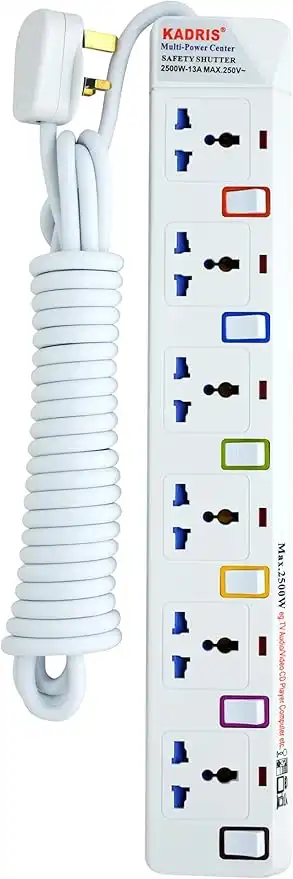 Kadris Power Strips 916 Heavy Duty Extension Cord with 6 Way Outlets and Individual Switch, 5 Meter Length, White