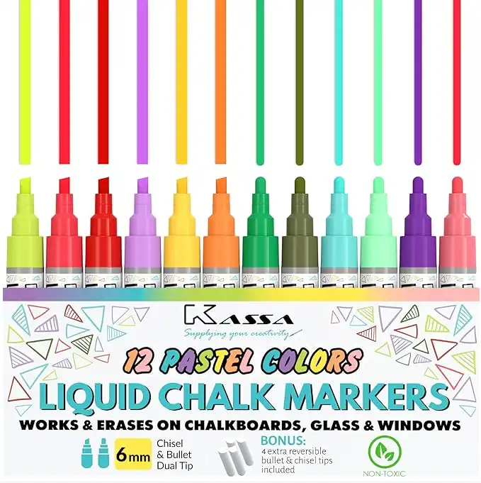 amazon.aeKassa Liquid Chalk Markers for Blackboards (12 Pastel Colors) - Erasable Chalkboard Pens work on Glass, Window, Black Board, Mirror - Include Reversible Chisel & Bullet Tip - Dustless & Non-Toxic Ink