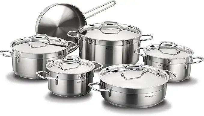 Korkmaz Alfa Plus 11 Pieces Tri-Ply Bottom Stainless Steel Cookware Set | Sandwich Bottom Induction Compatible Pots and Pans Set | Silver - KA1610