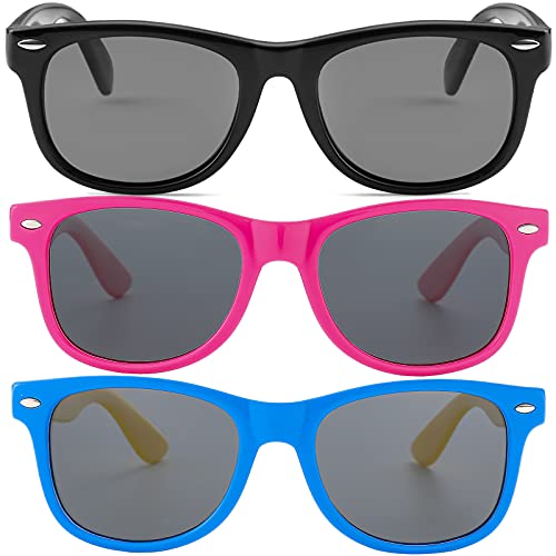 Kursan Kids Polarized Sunglasses for Boys Girls TPEE Rubber Flexible Frame Shades Age 3-12, 01 Bright Black + Rose Red/Pink + Blue/Yellow (3 Pack)