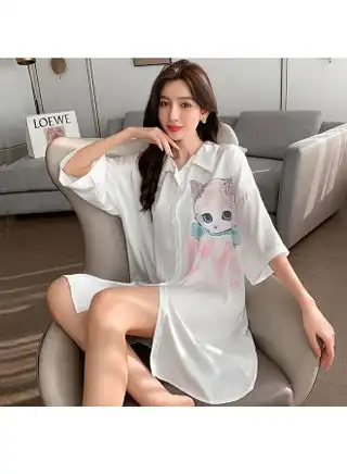 Ladies Spring And Summer Chiffon Short-Sleeved Printed Shirt Nightdress Sleepwear Nightwear