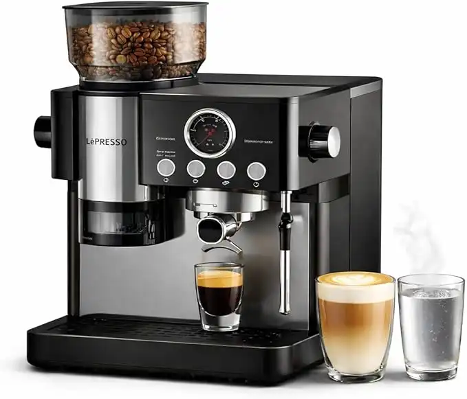 amazon.aeLePresso Semi-Automatic Coffee Machine with Adjustable Grinder, Espresso Machine with Smart Tamping System, Industrial 58mm Porta Filter, 19Bar Pump, Multiple Brewing Option, Large Water Tank Capacity