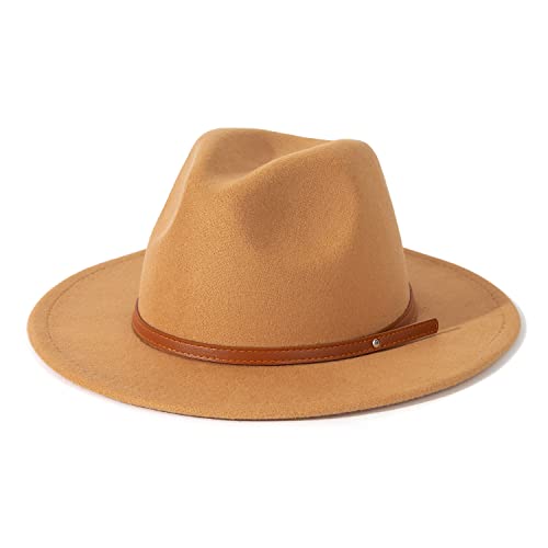 Lisianthus Womens Wide Brim Fedora Hat Felt Jazz Cap with Belt Buckle Décor, Camel, M