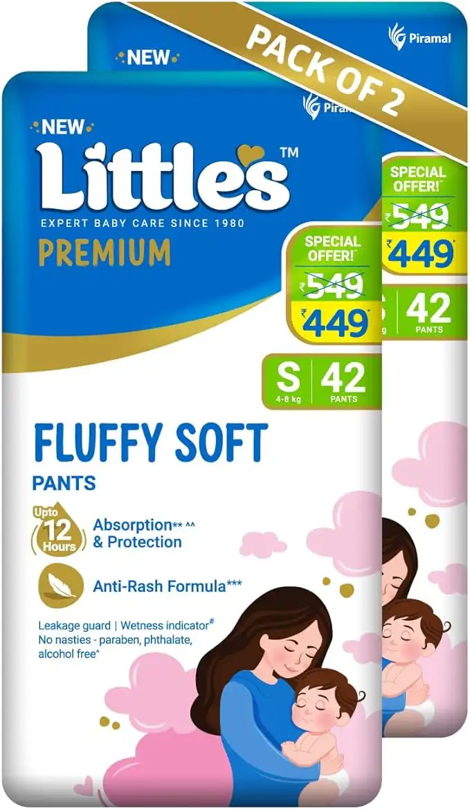 Little's Premium Baby Diapers S Size (Small) Pants Style | 4-8 kg | 84 Count - (42 x Pack of 2) | FluffySoft Baby Diaper with Leakage Guard, Wetness Indicator & 12 Hours Absorption