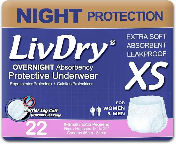LivDry Adult XS Incontinence Underwear, Overnight Comfort Absorbency, Leak Protection, X-Small, 22-Pack