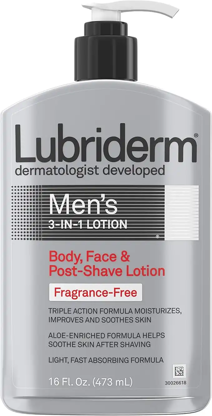 Lubriderm Men's 3-In-1 Unscented Lotion Enriched with Soothing Aloe for Body and Face, Non-Greasy Post Shave Moisturizer, Fragrance-Free, 16 fl. oz
