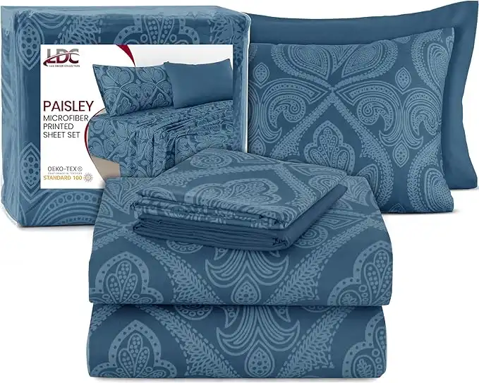 LUX Décor Paisley Queen Sheet Set, 6 PC Soft Microfiber Wrinkle Free Sheets - Luxurious Printed Bed Sheets Includes Flat Sheet, Fitted Sheet with Deep Pockets, & 4 Pillowcases - Navy Blue — Price History & Tracker | DeserTracker
