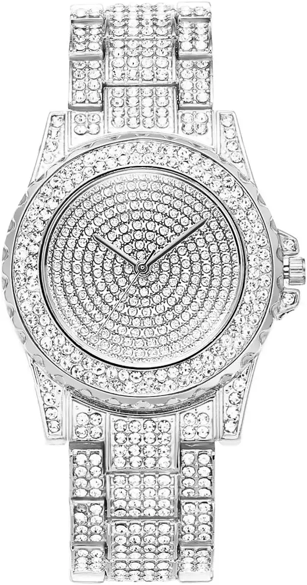 ManChDa Ladies Iced Out Watch with Quartz Movement, Analog Display, Stainless Steel Band, Rhinestones, 2.5" Glacier Silver — Price History & Tracker | DeserTracker