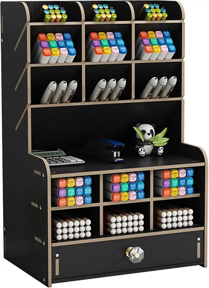 Marbrasse Upgraded Wooden Pencil Holder, Pen Organizer for Desk with 15 Compartments + Drawer, Desktop Stationary Storage Organizer Caddy, Easy Assembly (Black) — Price History & Tracker | DeserTracker